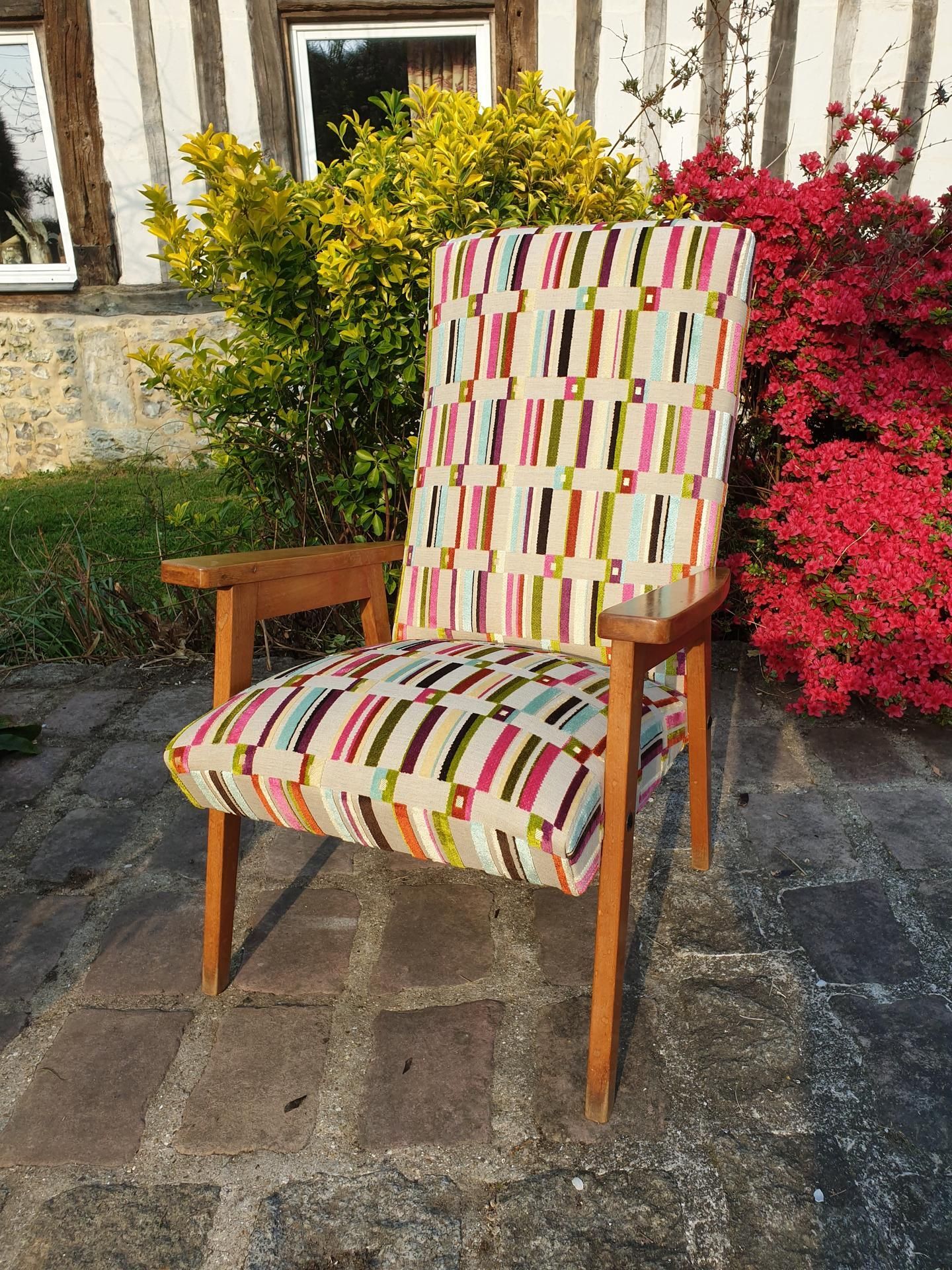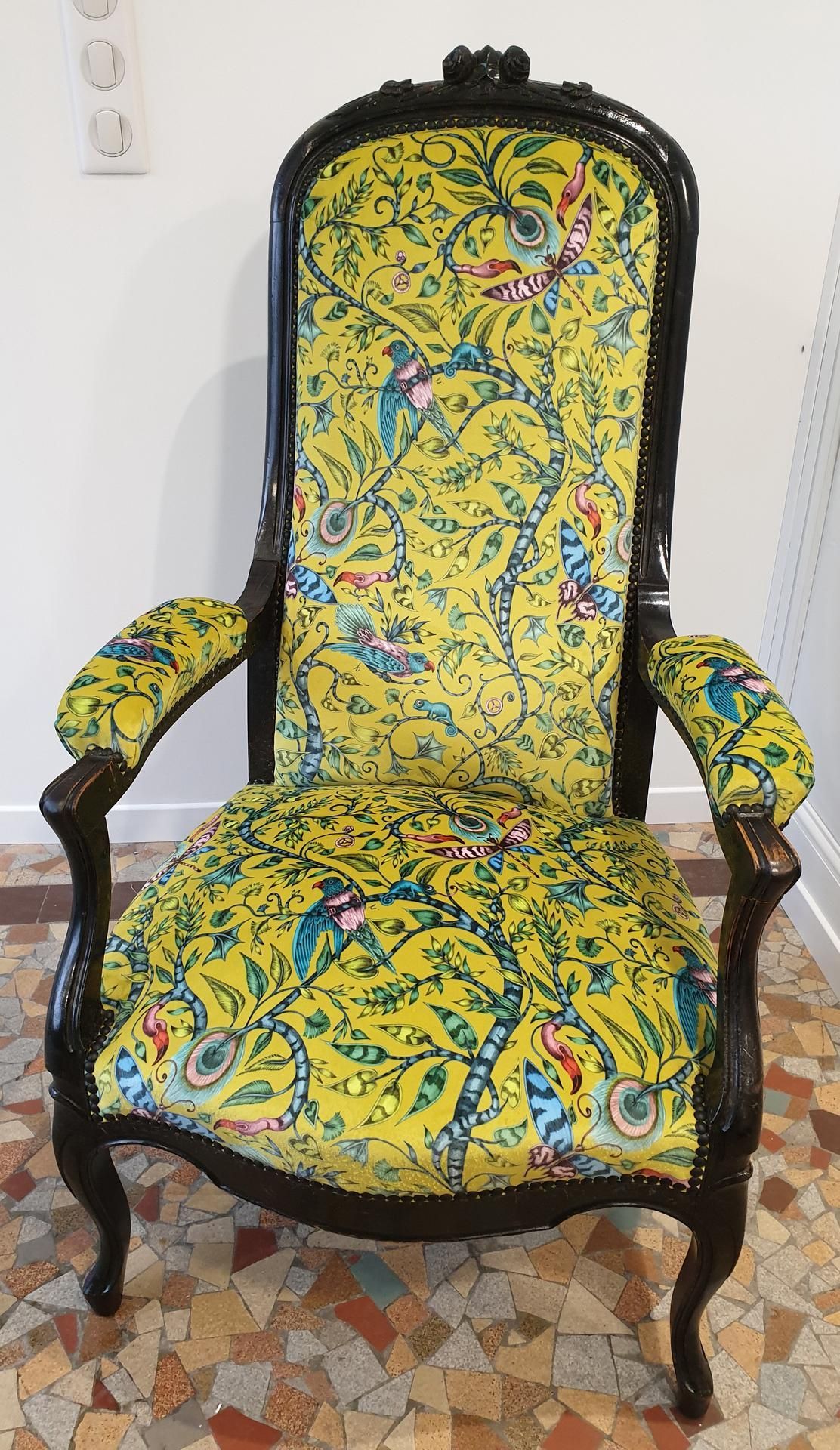 En plus de ses compétences en réfection et relooking de sièges, il propose également une sélection de mobilier rénové à la vente dans sa boutique.